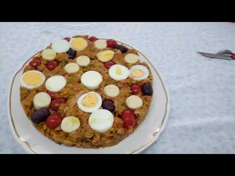 Unte uma forma, decore o fundo com o ovo, o tomate cereja o palmito e azeitonas
